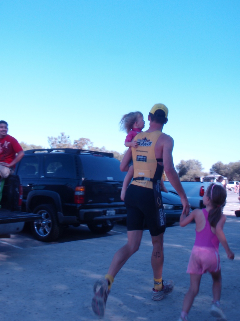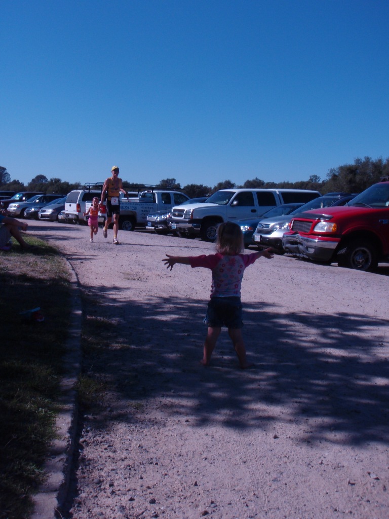 back to transition first. Her 1 mi. run against my .75mi swim.